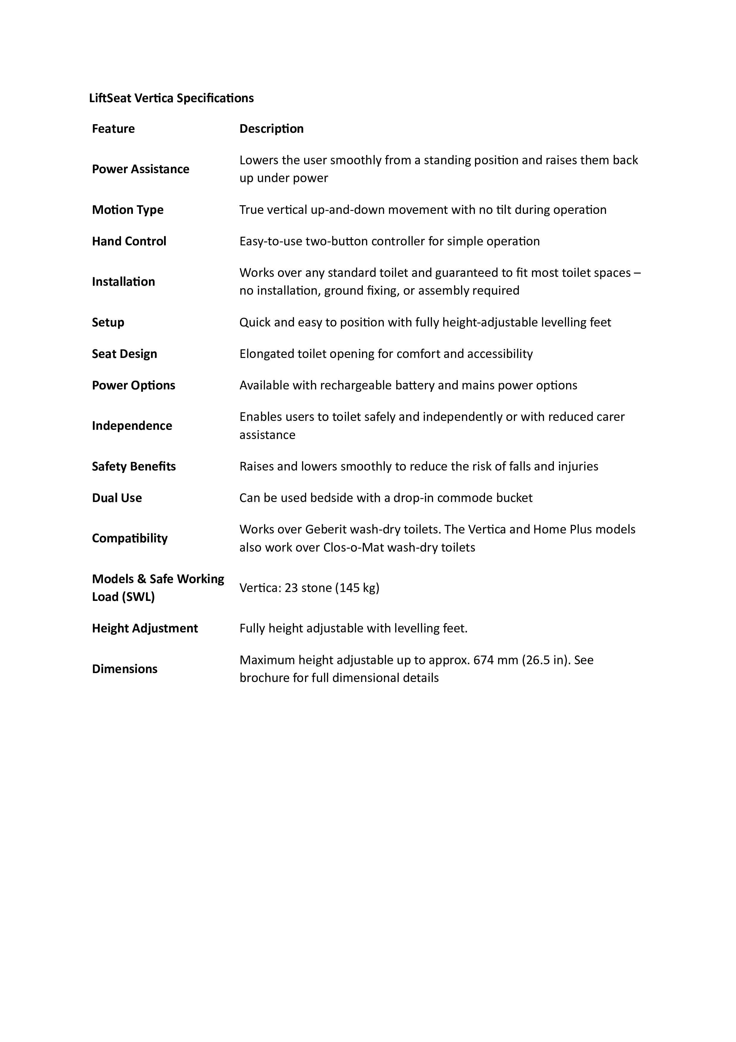 Lift Seat Vertica is a vertical-powered toilet lift designed for people who need a stable, straight up-and-down motion to safely access the toilet. It lifts and lowers users without any forward tilt, making it ideal for those who must lock their knees or need extra leg stability when transitioning to standing. The Vertica provides a dignified, independent toileting solution that reduces fall risk and strain for both users and carers. It is height adjustable, requires no installation and works over most standard and accessible toilets even in tight bathrooms. For users who prefer a more gradual lifting motion with a slight forward tilt, the Lift Seat Home electric toilet seat lift offers an alternative option.