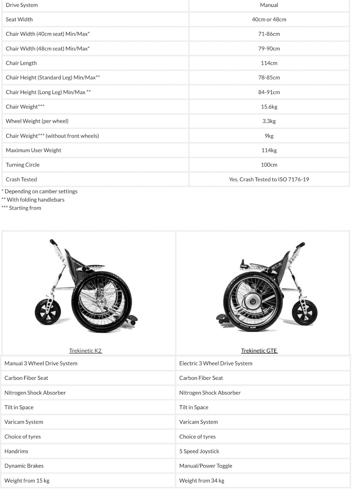 The Trekinetic K2 is an ultra light, all terrain manual wheelchair. Engineered with Formula 1 grade carbon fibre and a patented rear shock absorber, it delivers a smooth, responsive ride across beach sand, forest trails, cobbles and city streets. Weighing just 15 kg, the Trekinetic K2 folds fast and fits most car boots with ease.
